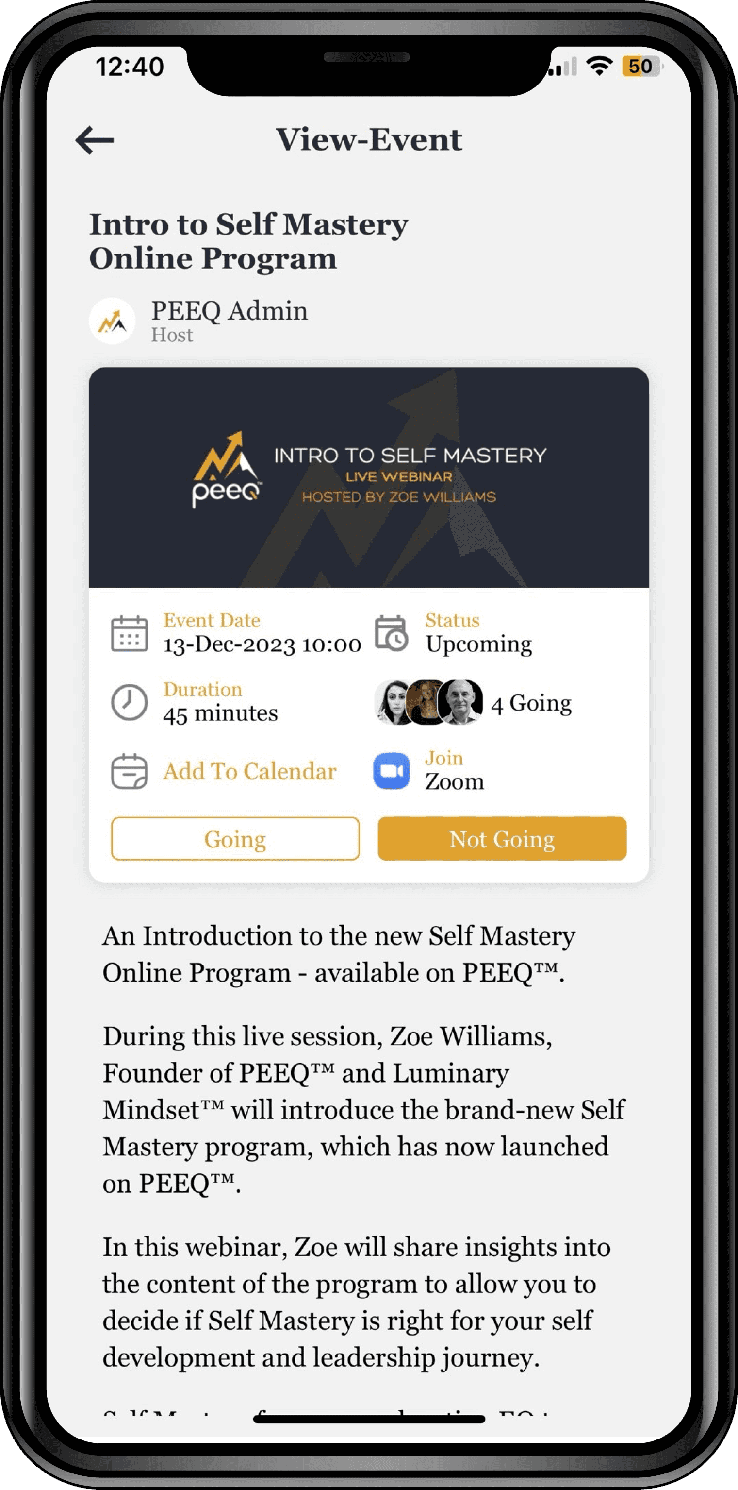 As a valued member of PEEQ®, discover a calendar of regular live events, webinars and masterclasses from a team of expert accredited coaches focused on creating discussion around the topics that matter most to you.